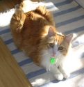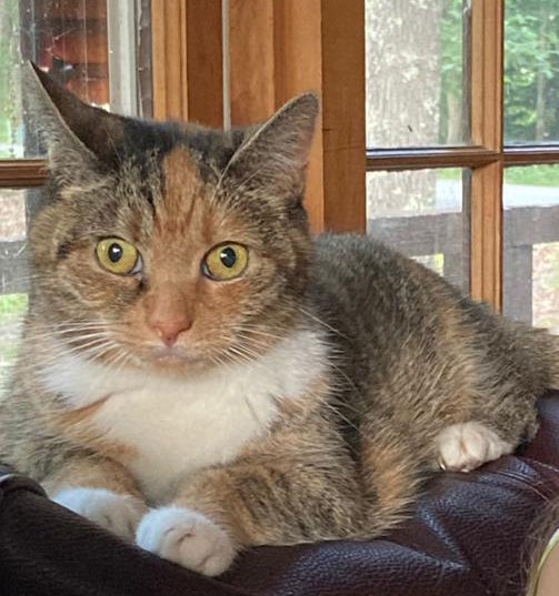Coco was rescued almost a year ago with Rosabella and her 5 other kittens. She was either feral or a long term stray, missing a toe, a tooth, and quite a bit of her tail. She and Rosabella have grown very comfortable and fond of me, but they will still dive under the armchair and hide if anyone comes over.