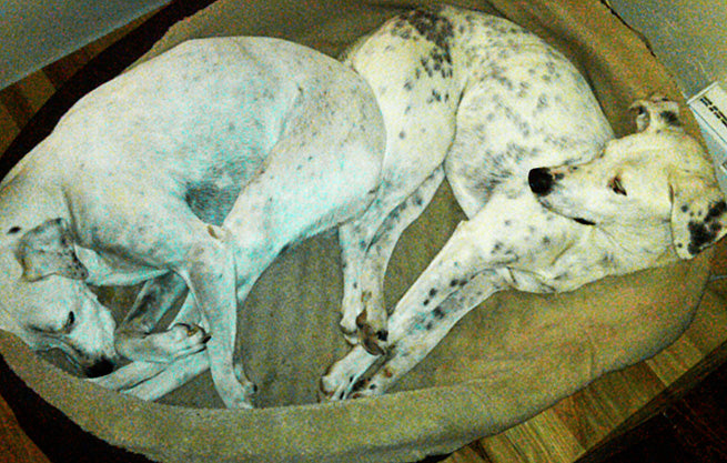 Dean was a foster puppy from Dalmatian Rescue, the same organization that brought us Pixie, and we adopted him. I don’t know what he was eating in the shelter but since he’s been in our family he eats the same homemade vegetarian diet with Vegepet ingredients that Pix always has. He’s sweet and gentle, while Pixie’s a drama queen, but they’re both happy, healthy and active family members.