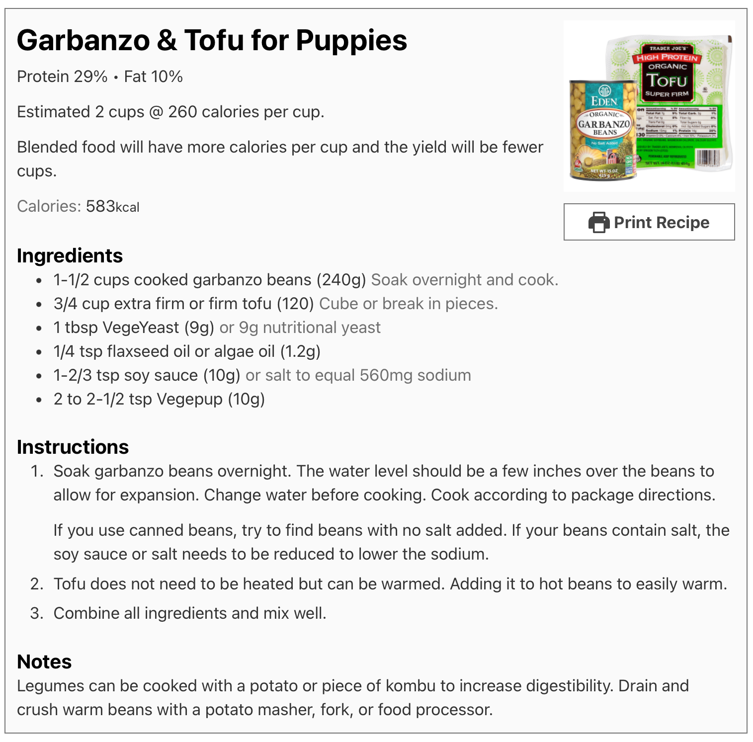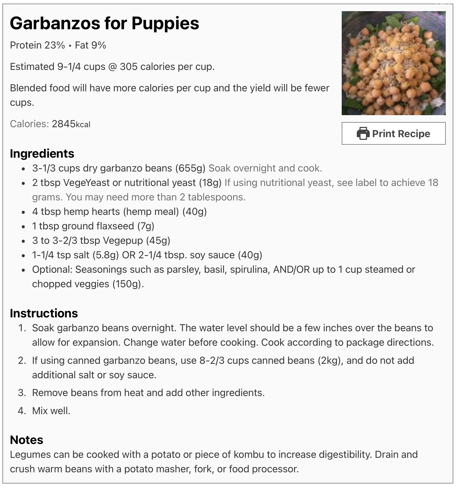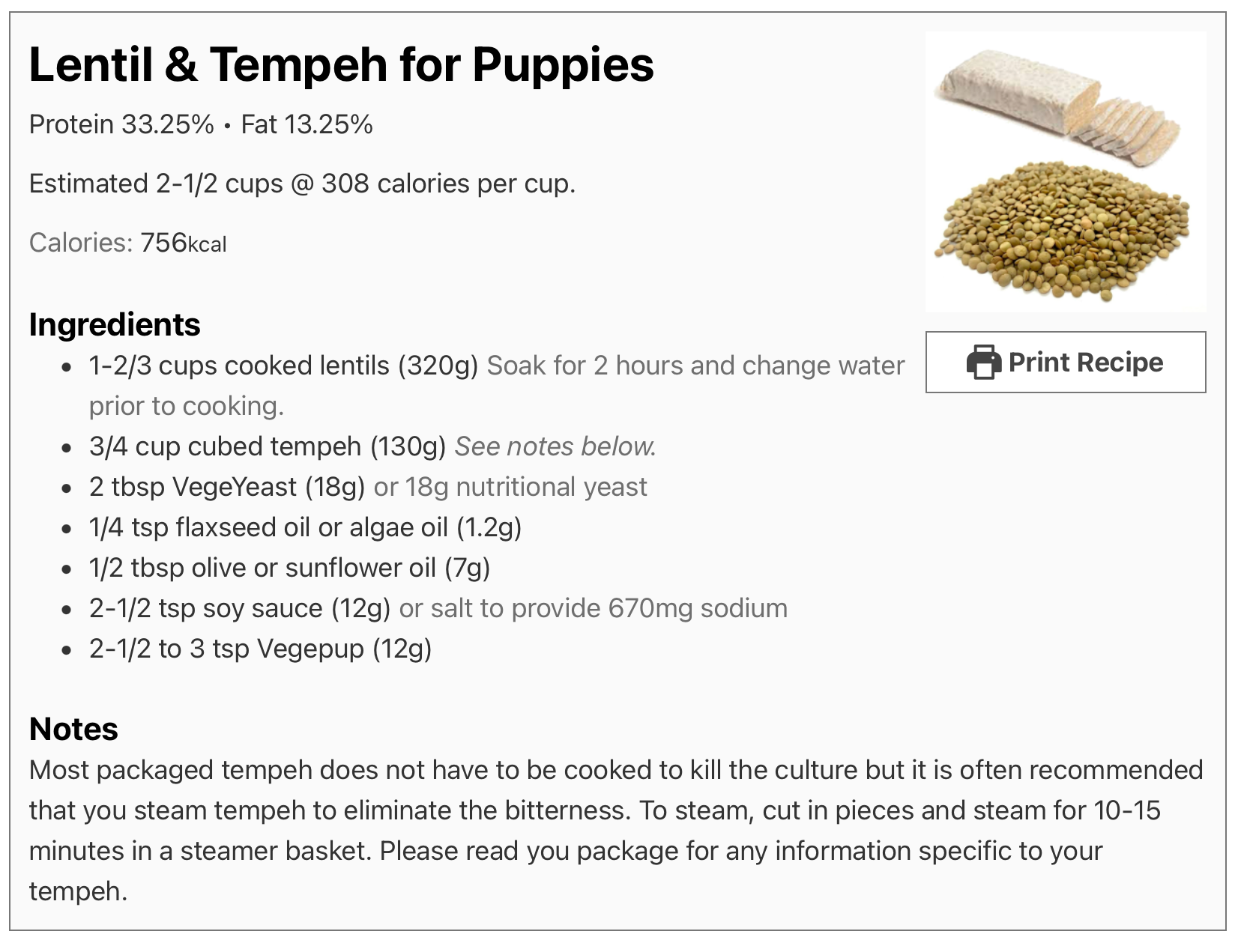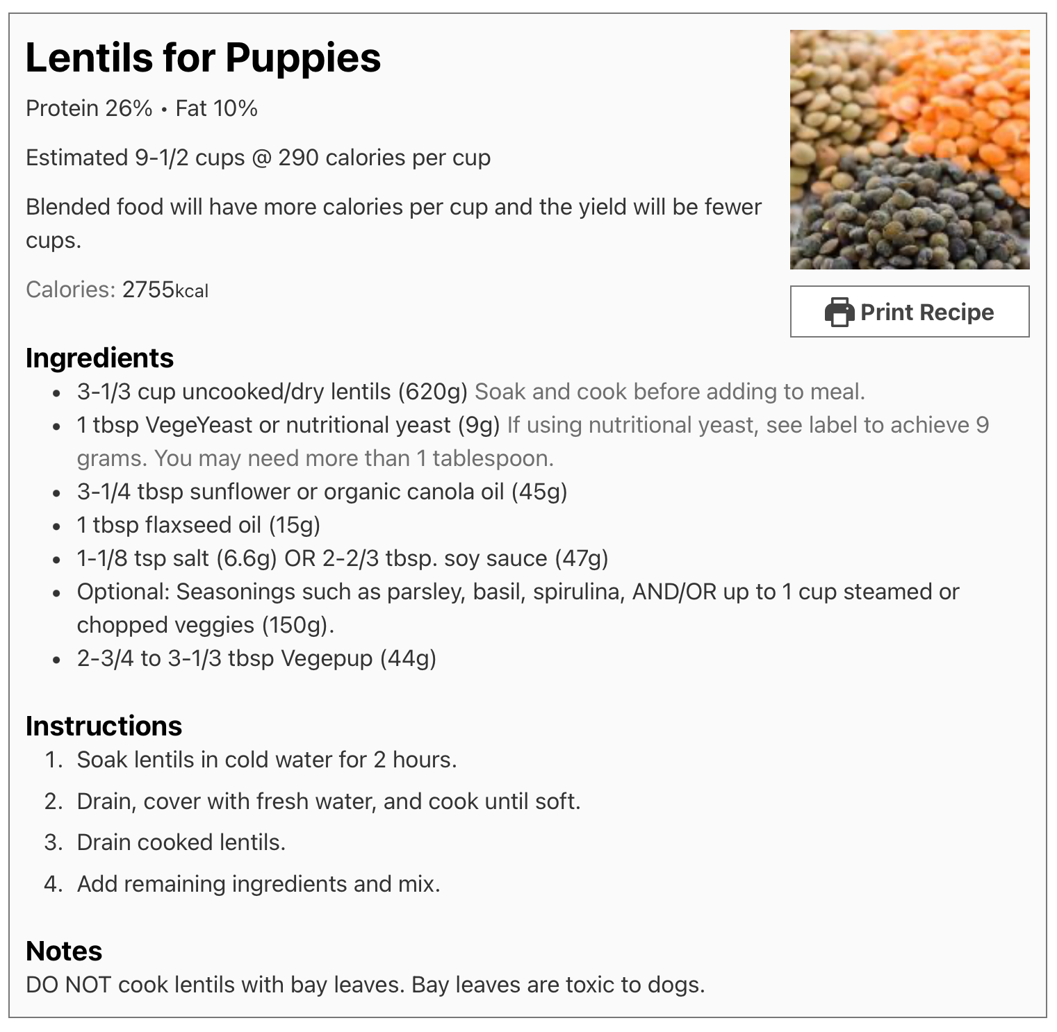 Example: If you have a 3-month old puppy who weighs 10 lbs, the above calorie calculator recommends feeding 654 calories per day. Let’s say you prepare the Lentil Recipe and end up with 9-1/2 cups of a whole lentil food. Since the recipe is a total of 2755 calories, you have 290 calories per cup.Â
