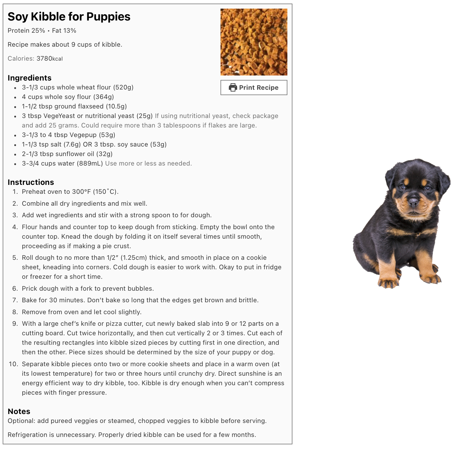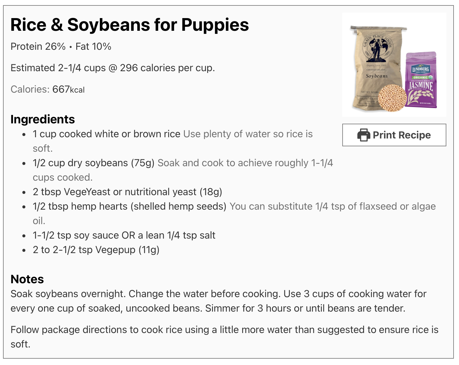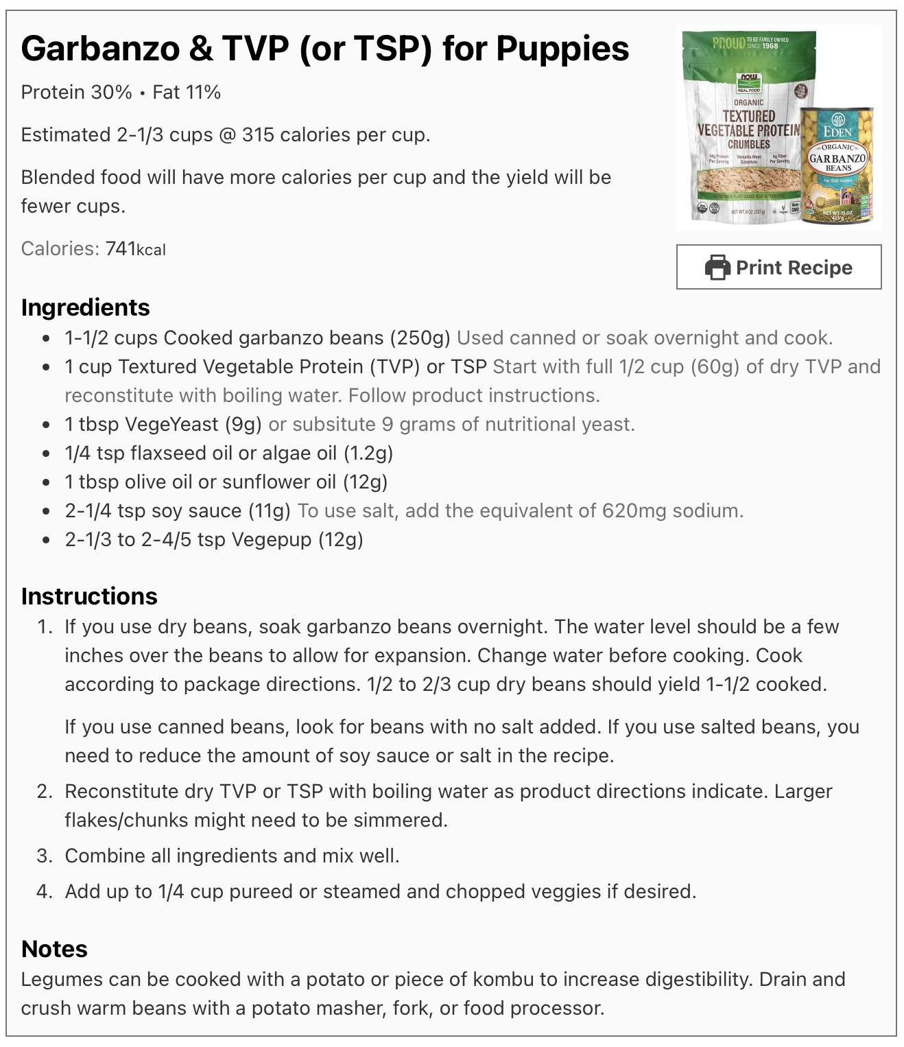 Our Vegepup™ recipes have the amount of Vegepup™ factored into the recipe. If you modify our recipes, please only substitute legumes for legumes or grains for grains, and be mindful of the protein content in your puppy’s diet; it should be roughly 30%.
