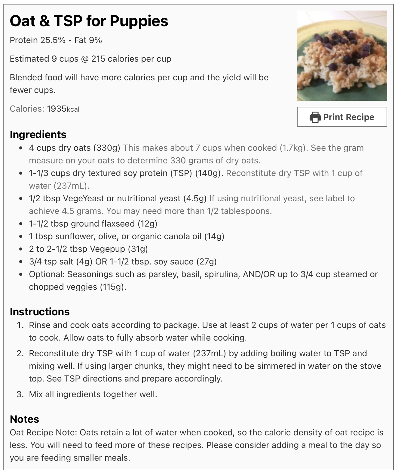 Due to variations in ingredients, the amount of water used, cook times and methods, whether you mash or puree your meals, the vegetables you add, etc., everyone is going to end up with a different volume of food from our recipes. The above method is the most accurate way to determine how much to feed. That said, each recipe below gives an estimate of how many cups it yields, and how many calories per cup, prior to blending or mashing and adding vegetables.