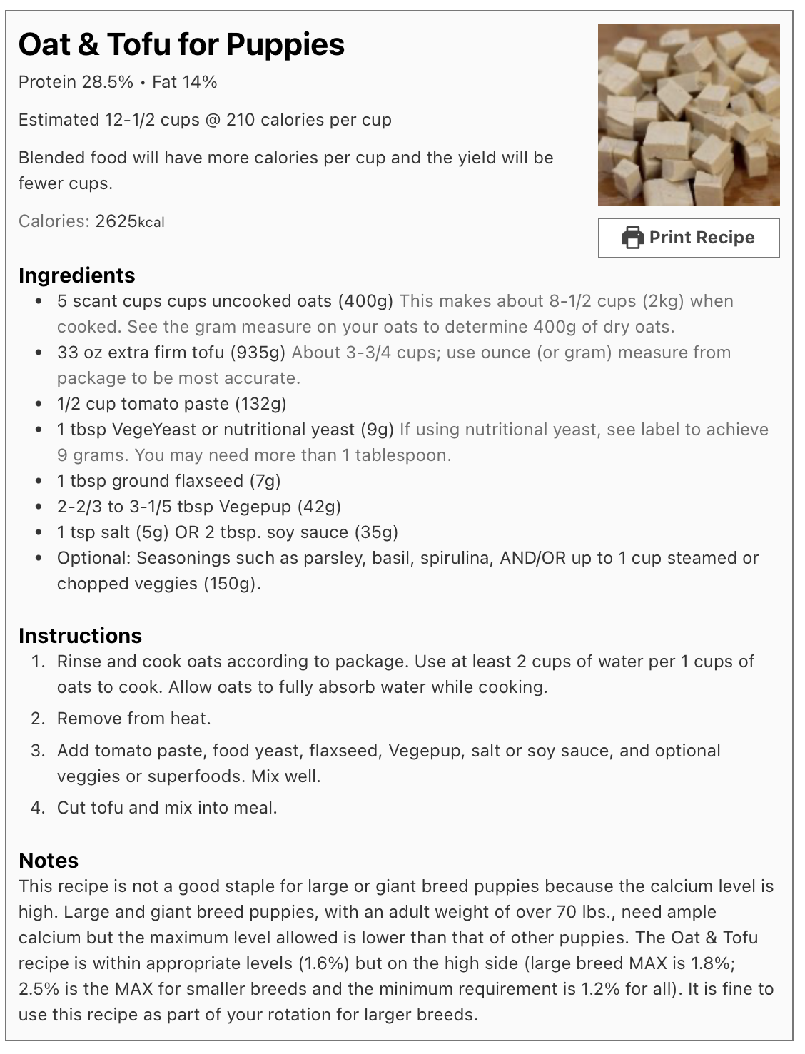 Young puppies need 2 times more calories per pound of body weight than an adult dog. They eat more per pound of body weight (and more often) and need the added nutrients in Vegepupâ„¢. Pregnant or lactating mamas also eat considerably more than average adults. While not ideal, adult dogs who are not pregnant or lactating may eat recipes prepared with the Vegepupâ„¢ supplement. Ideally, the Vegedogâ„¢ supplement and recipes should be used for dogs 12-months of age and older.