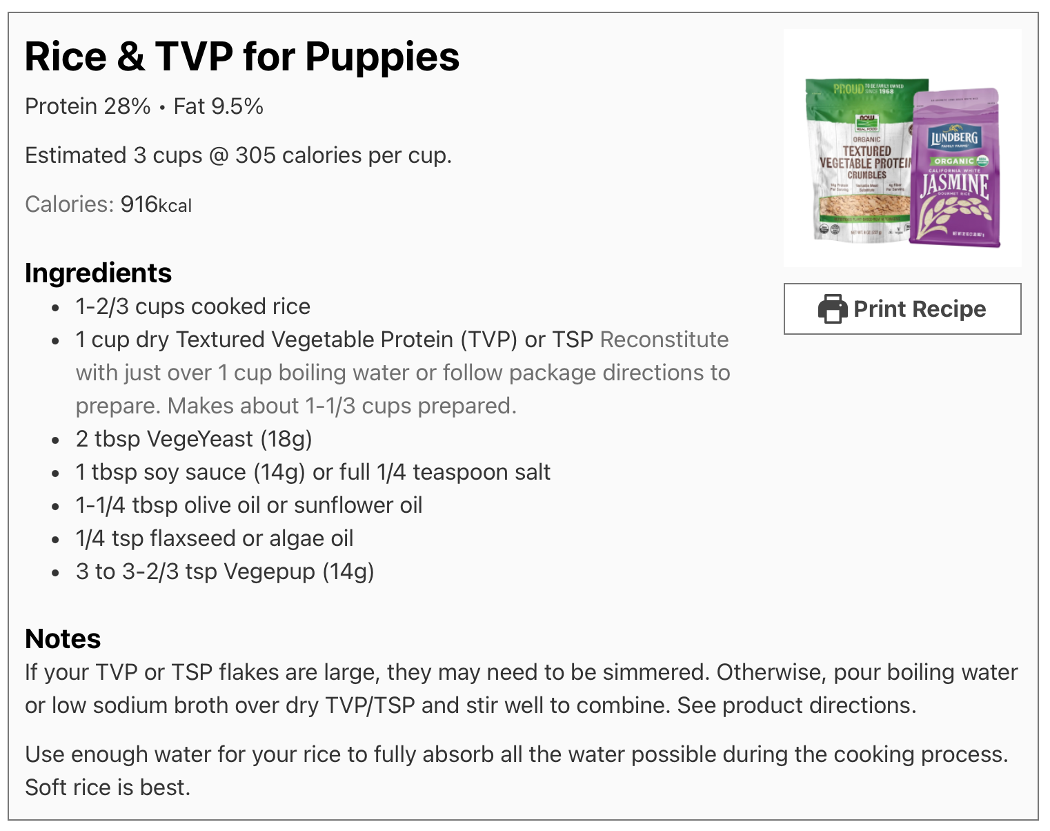On average, recipes need 1 tablespoon (16g) of Vegepup for every 1000 calories in a recipe.