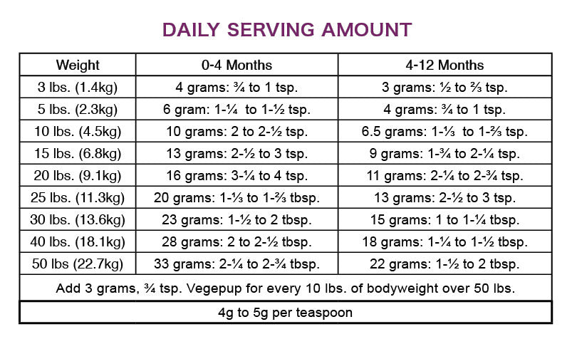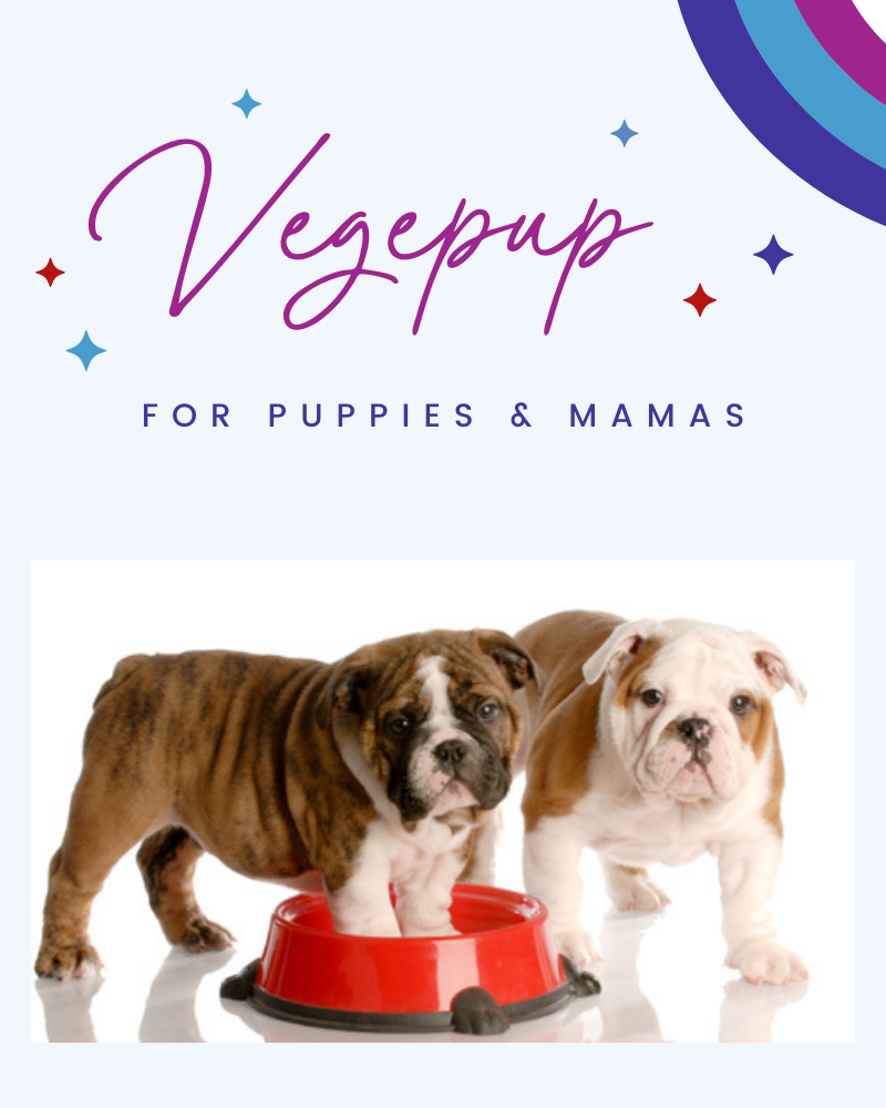 Puppies and pregnant or lactating dogs need roughly 30% protein in the diet and require some nutrient levels to be higher than those for an adult dog. For this reason, the Vegepup™ supplement and recipes should be used for puppies under 12-months of age and pregnant or lactating dogs. Vegepup™ has a higher calcium, phosphorous, and mineral level than Vegedog™ and has threonine added to enhance the amino acid profile of the diet. Vegepup™ is safe for large breed puppies who have a lower calcium maximum allowance, too.