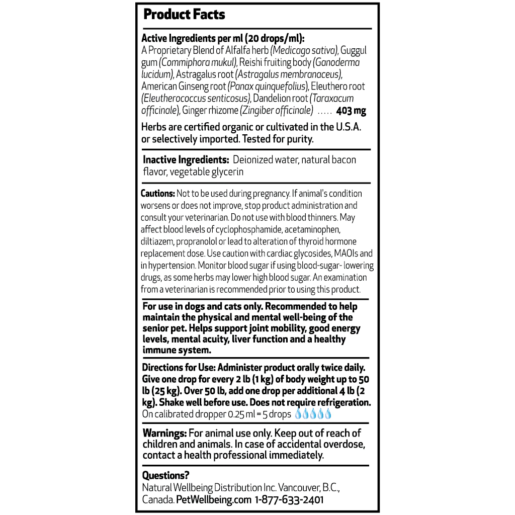 Old Friend was designed by a holistic veterinarian to support and maintain great health for your dog or cat as he or she ages. Common to the aging process are the degradation of connective tissue and joints, cardiovascular, adrenal, liver, pancreatic and cognitive function. All animals, even those having lived healthy and vibrant lives, can experience changes in these common areas. In general, energy, movement or vitality may decline, either slightly or broadly. By supporting key body systems and decreasing general inflammation, your pet has a huge advantage to live life to the fullest. If your companion animal could use support in these areas, consider the Old Friend tincture: