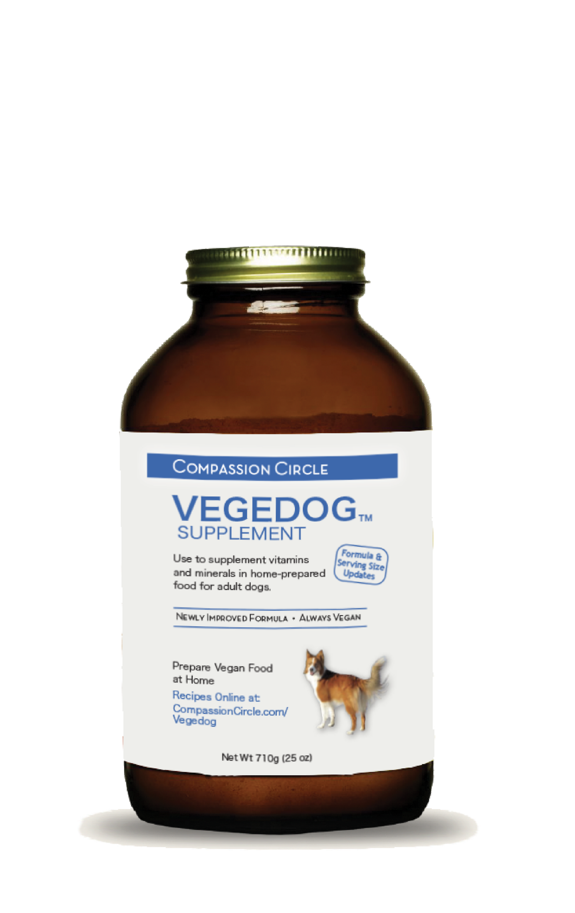 Our Vegedog™ recipe brochure will ship with the supplement. You will also find the recipes at https://compassioncircle.com/vegedog/ and can download the brochure HERE. Please read the introductory portion of the recipe brochure thoroughly before preparing meals. Recipes list the amount of supplement required for that recipe. You may increase or decrease the amount of food you prepare by proportionally increasing or decreasing all ingredients in the recipe. If you create your own recipes, closely based on ours, divide the daily serving size (from the label) between meals. It is best to mix the supplement into prepared warm food. If you want to modify our recipes, you may substitute legumes for legumes or grains for grains. You can add a variety of fresh vegetables to our recipes, or nutrient dense meal toppers, but vegetables should not make up more than about 10% of the diet. If you add too many veggies, the calorie density, protein levels, and fat levels can be compromised.